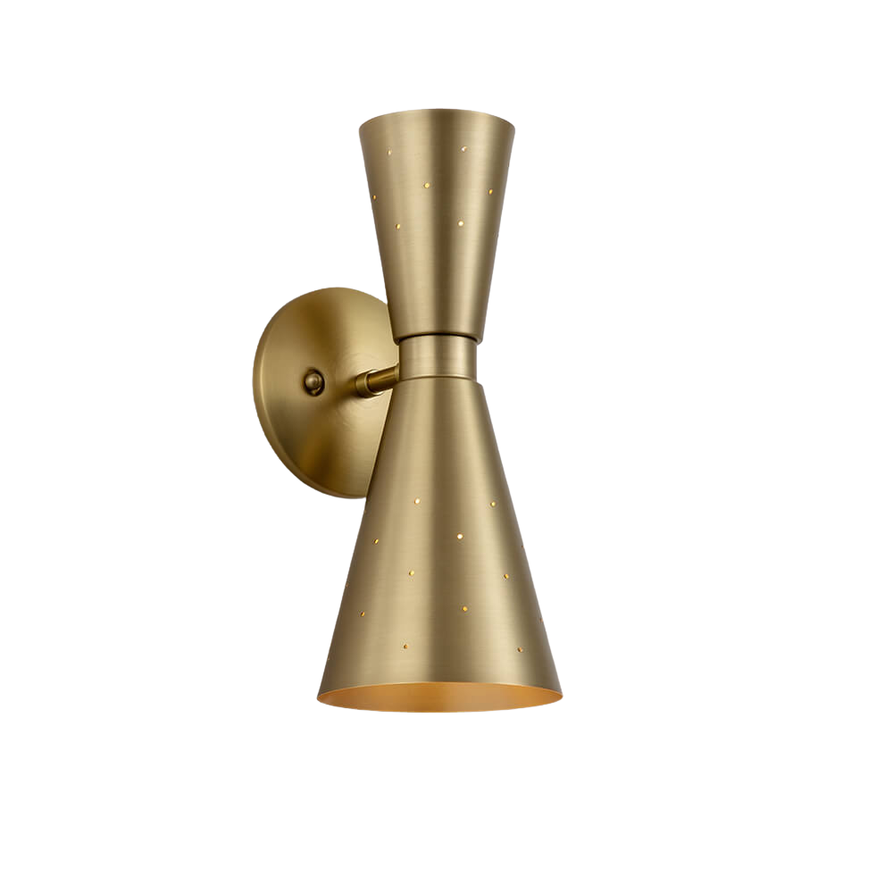 Ten kinkiet ścienny wyposażony jest w dwa źródła światła skierowane w górę i w dół. Konstrukcja obejmuje metalowy stelaż z okrągłą rozetą montażową oraz krótkim ramieniem. Podwójne klosze w kształcie stożków posiadają drobne perforacje widoczne na powierzchni.