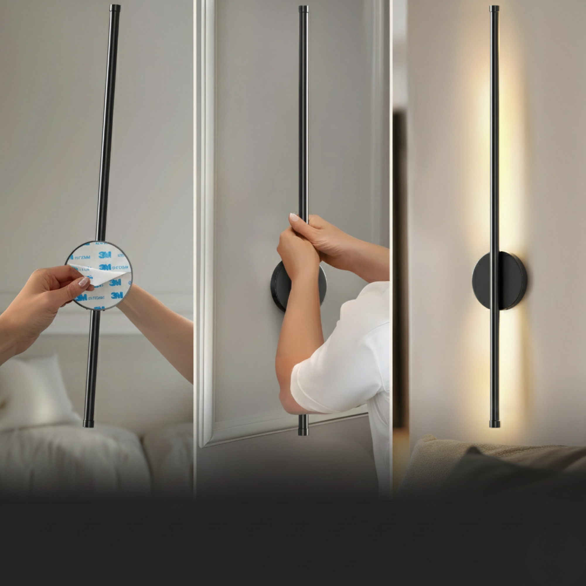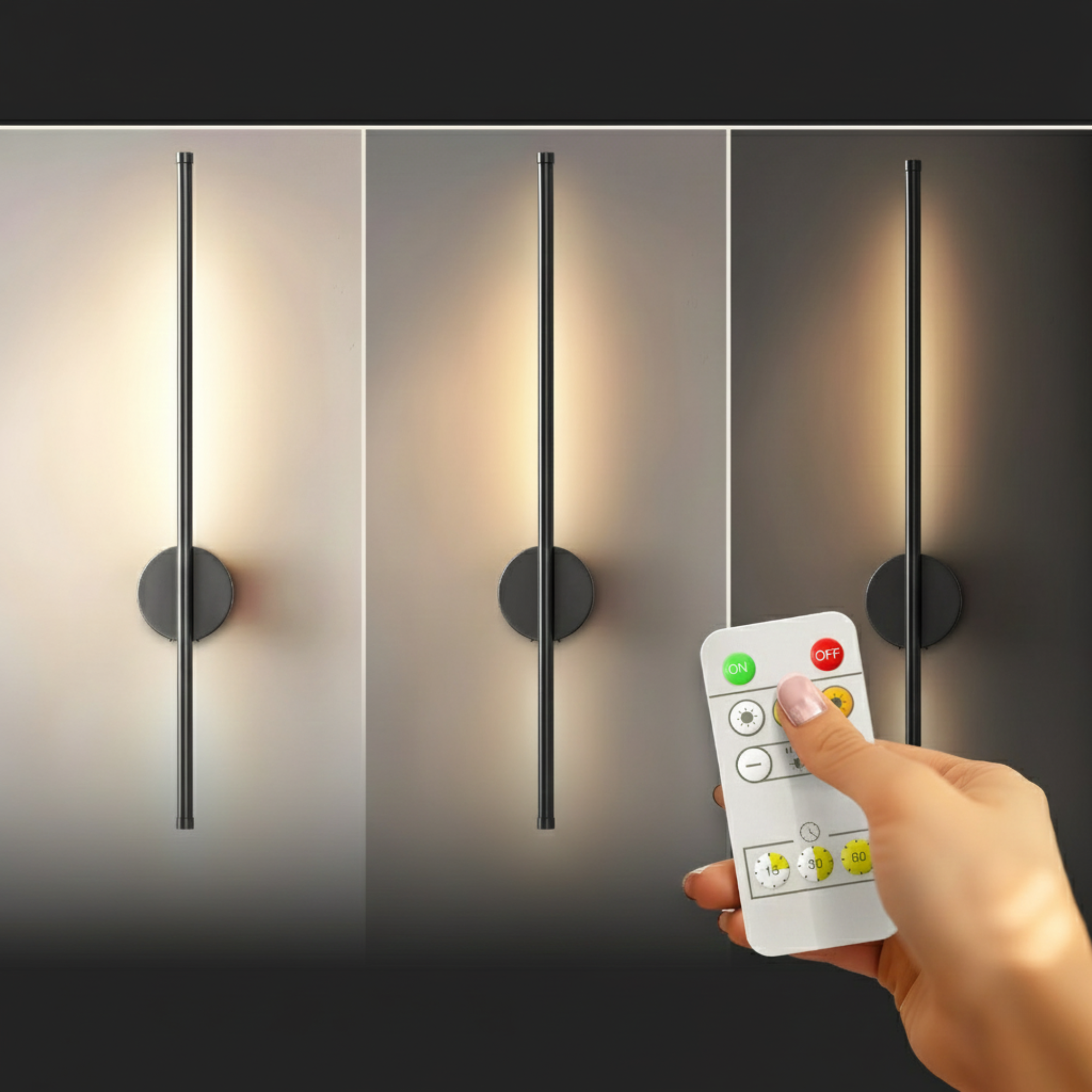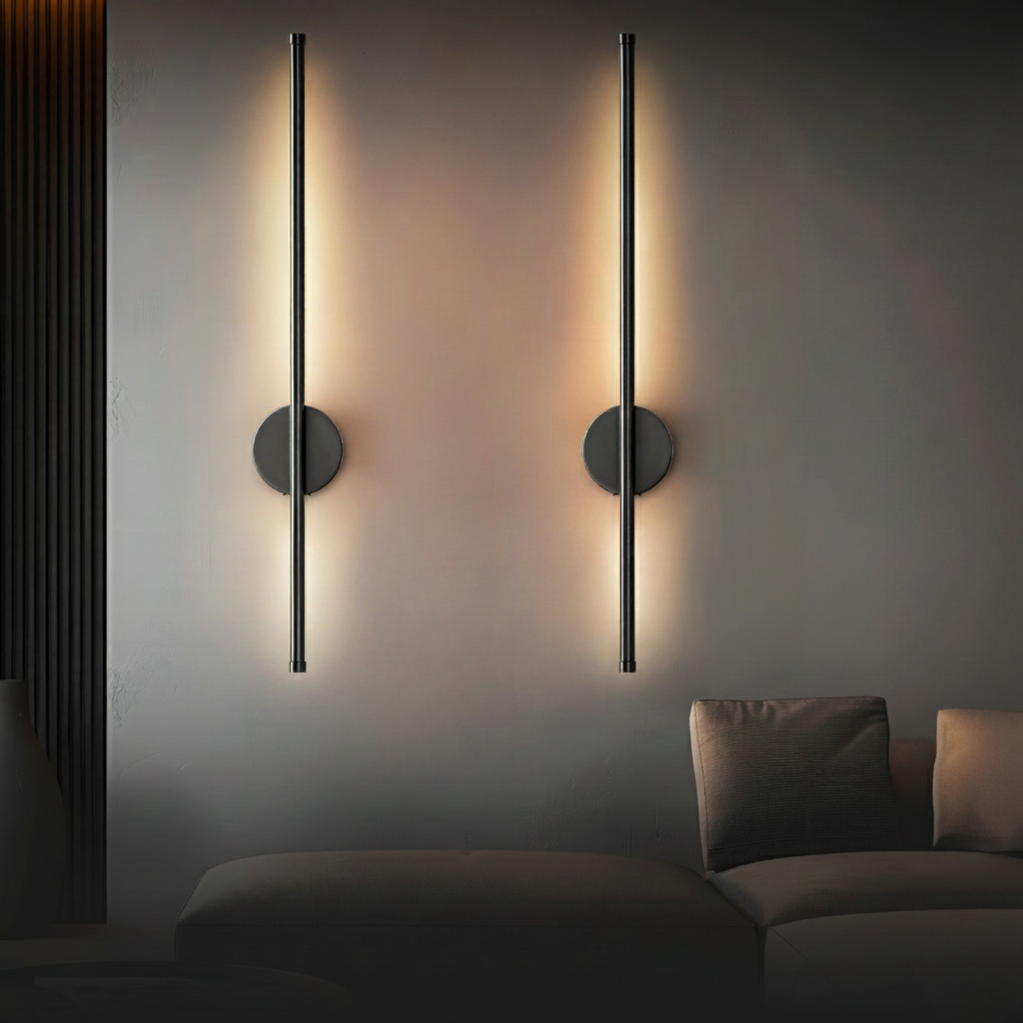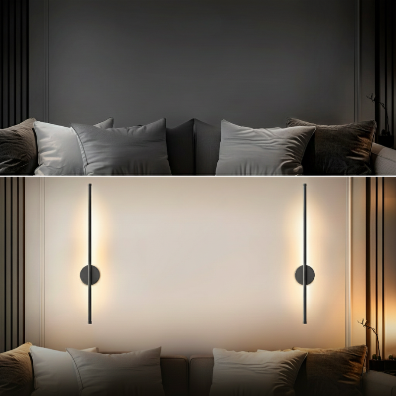 Zestaw dwóch bezprzewodowych lamp ściennych z prostym paskiem LED, mocowanych płasko do powierzchni ściany.
