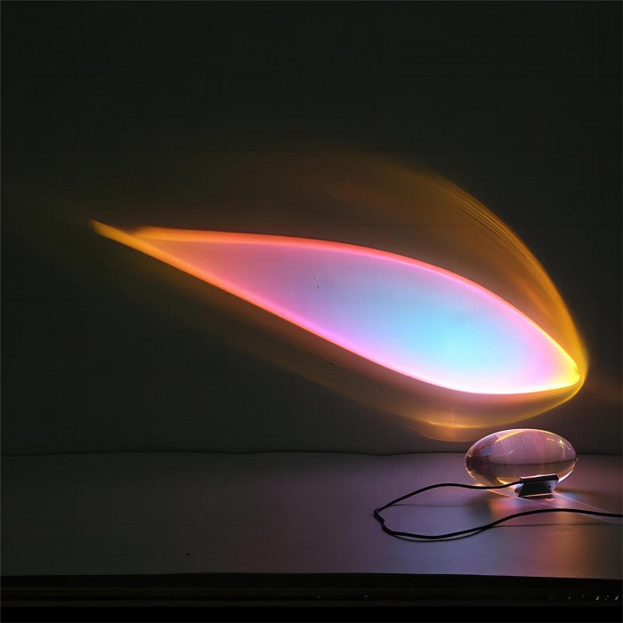 Ta lampa projekcyjna do użytku wewnętrznego wykorzystuje optyczną soczewkę do tworzenia spektralnego efektu świetlnego.