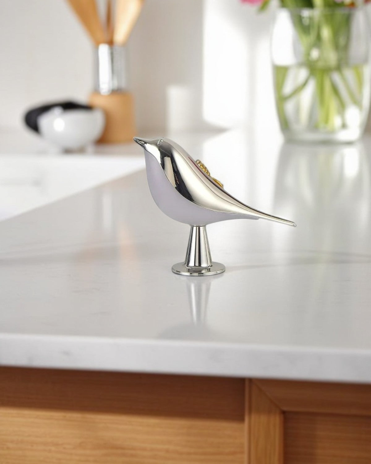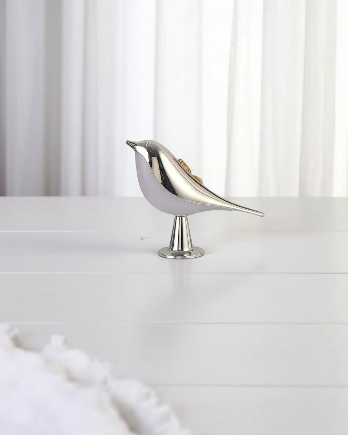 Lampa stołowa w kształcie sylwetki ptaka, umieszczona na płaskiej podstawie.