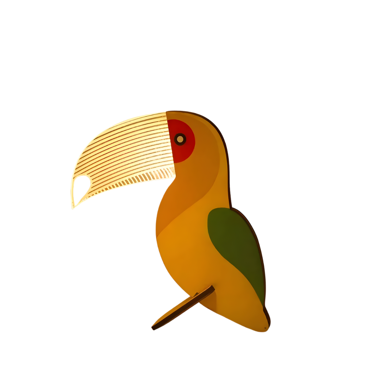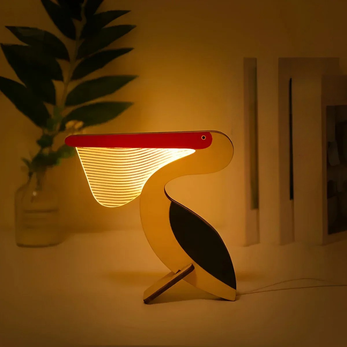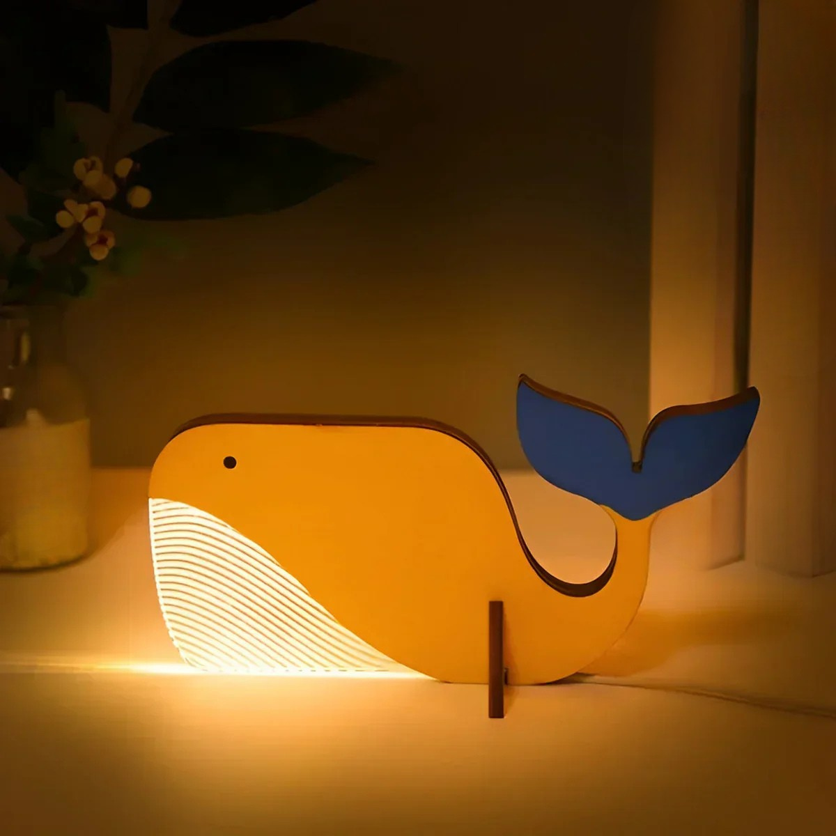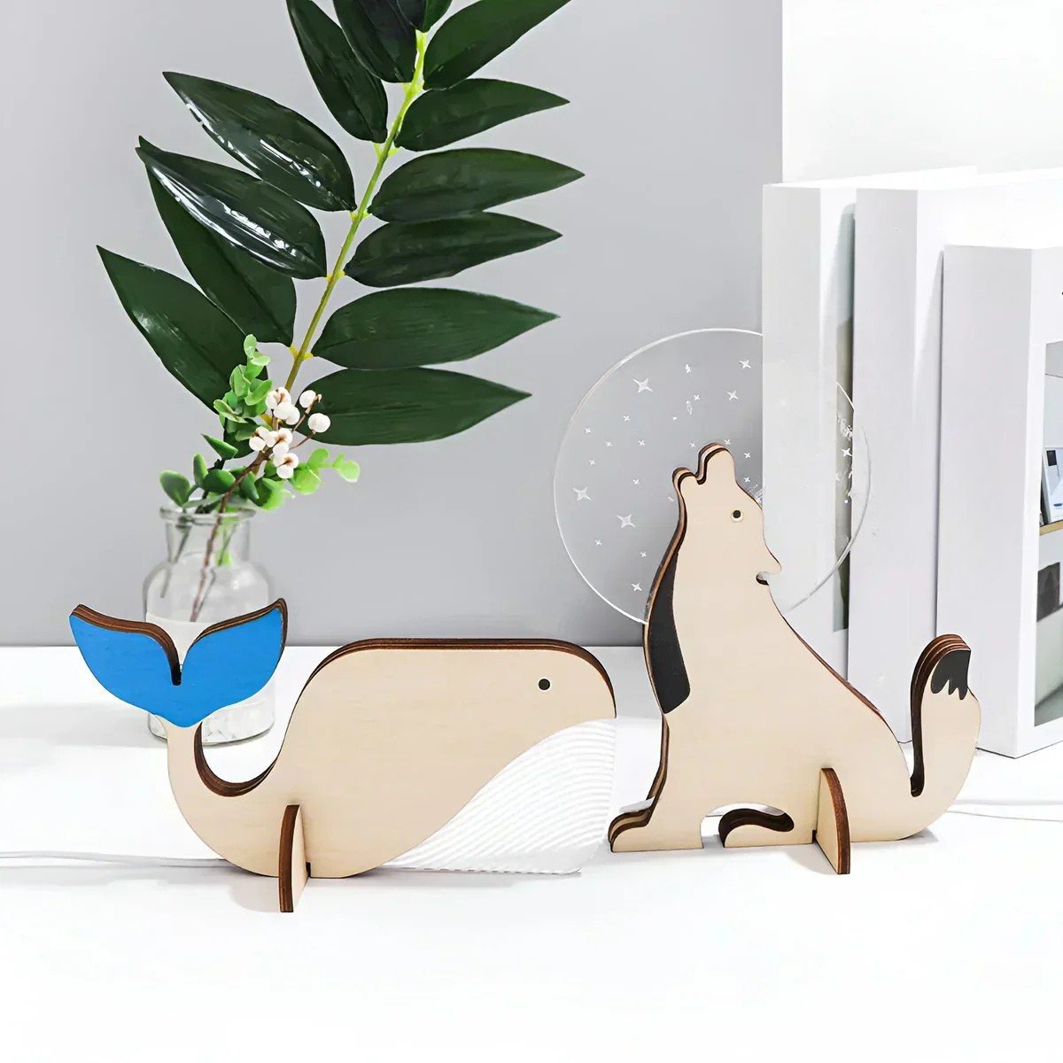 Lampka nocna led dziecięca dekoracyjna ma zakrzywiony, kompaktowy kształt z wyraźnymi liniami. Na kloszu znajdują się widoczne motywy zwierząt i konstelacji. Lampka jest zasilana przez USB i dostępna w różnych kolorach i wykończeniach.