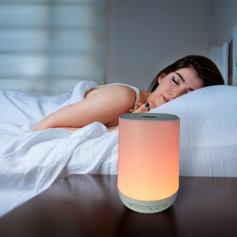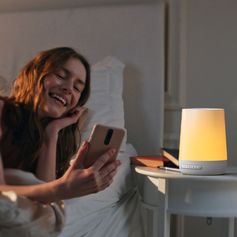 Lampa nocna przyłóżkowa urządzenie do białego szumu budzik zegar to inteligentne urządzenie do generowania białego szumu i oświetlenia nocnego. Urządzenie łączy funkcje sterowania głosem i zdalnej obsługi przez aplikację mobilną. Posiada szeroką bibliotekę dźwięków i regulowany timer pracy.