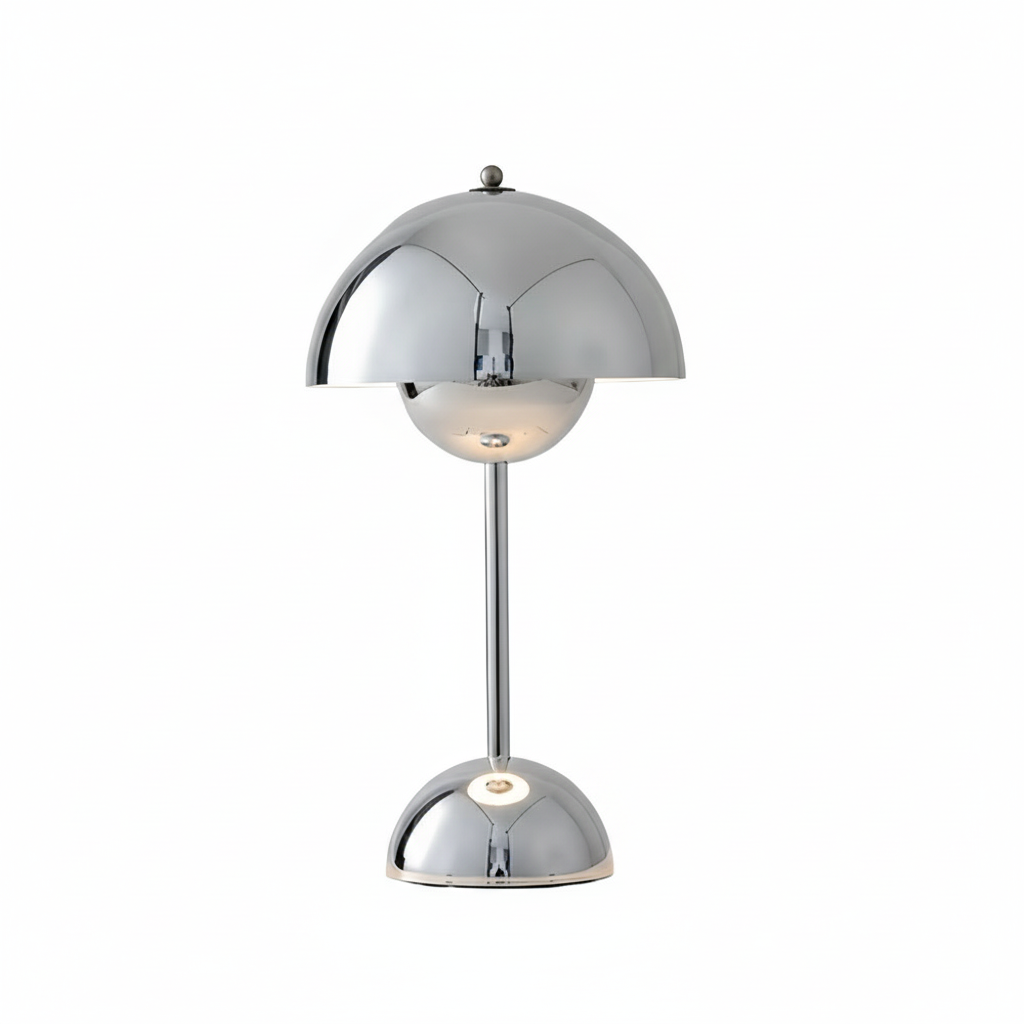 Lampa stołowa Lunada Chrome prezentuje zrównoważoną konstrukcję z gładką, jednolitą zewnętrzną powierzchnią.