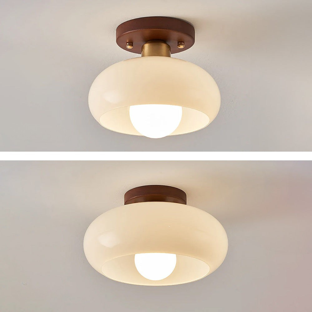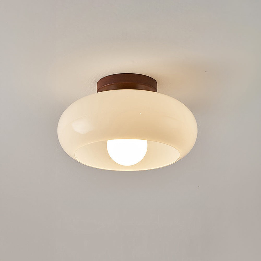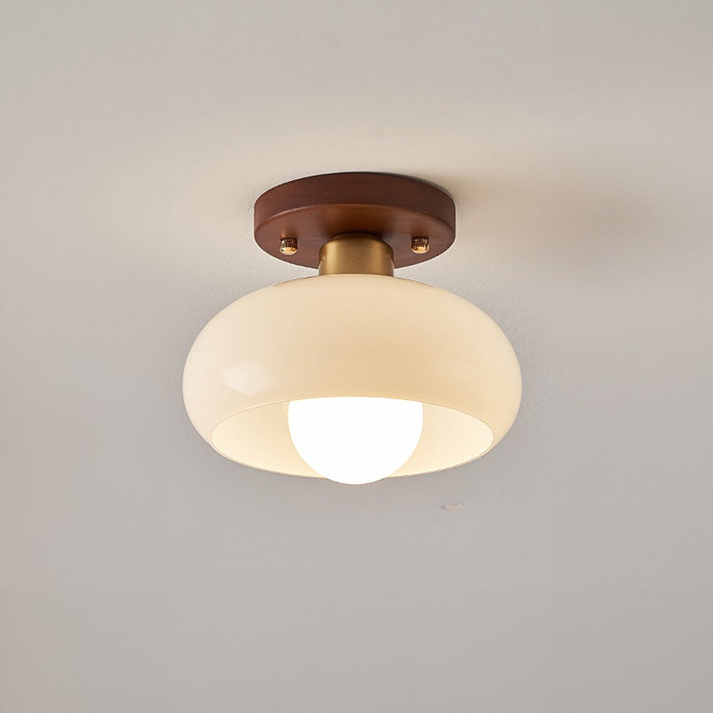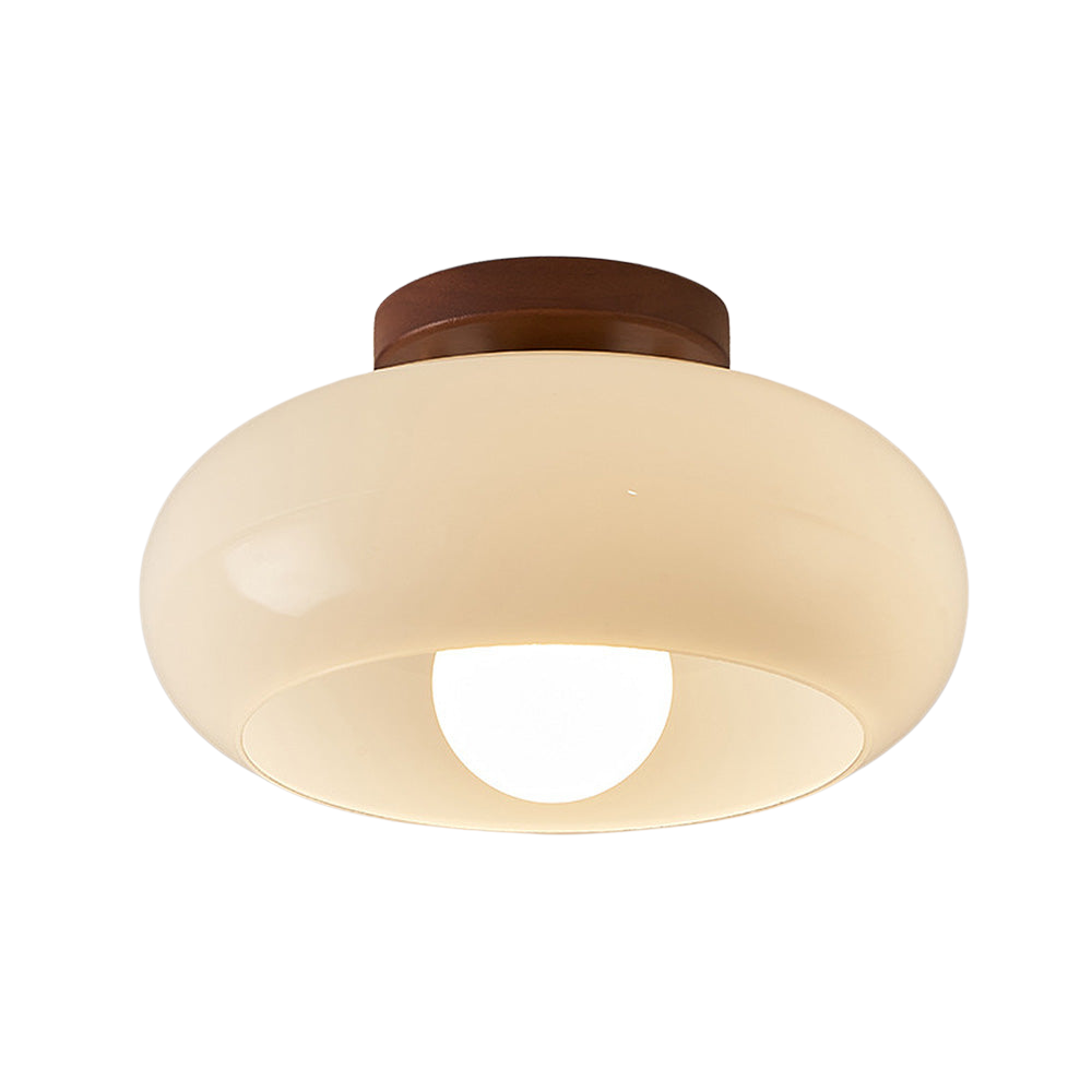 Lampa sufitowa z kloszem ze szkła i widoczną ramą drewnianą.