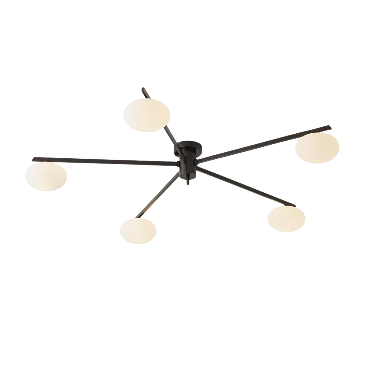 Lampa sufitowa nowoczesna wieloramienna biała prezentuje smukłą konstrukcję z czarnym ramieniem i białym, owalnym kloszem ze szkła. Niska forma sprawia, że pozostaje wizualnie lekka po zamocowaniu. Kompaktowy korpus podkreśla jej prosty, uporządkowany kształt.