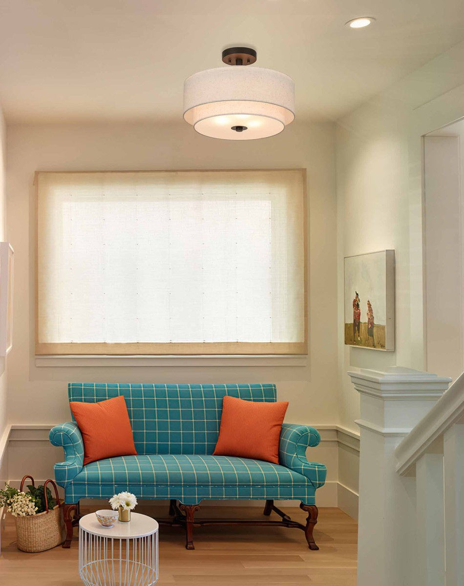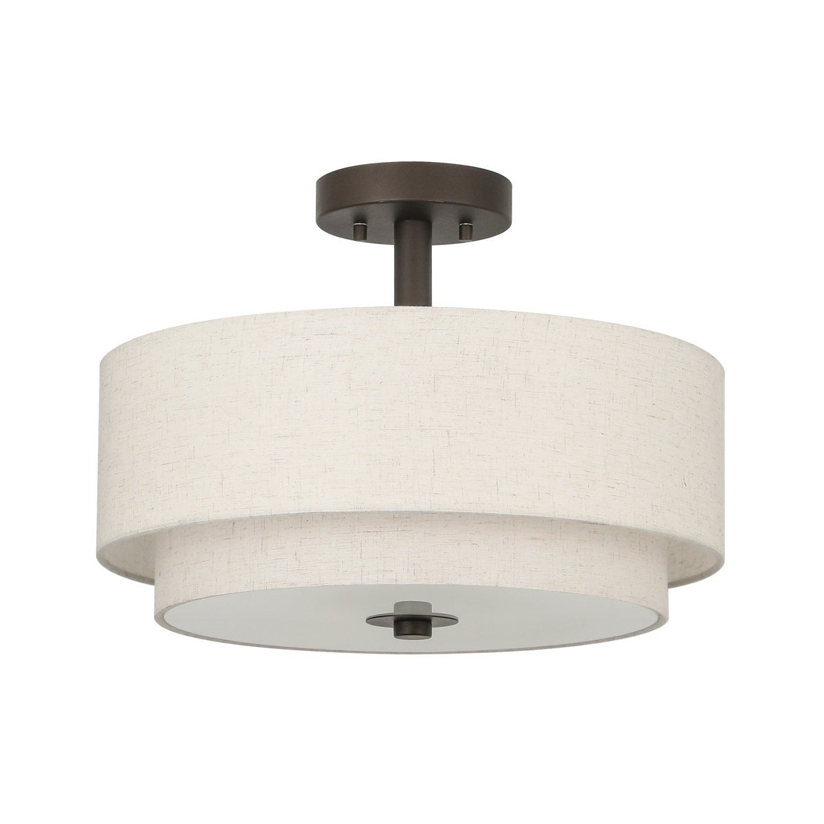 Ta lampa sufitowa posiada podwójny, piętrowy klosz w kształcie bębna ułożony jeden nad drugim, zawieszony na krótkim pręcie i okrągłej podstawie montażowej na suficie.
