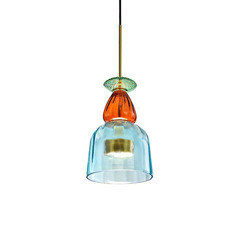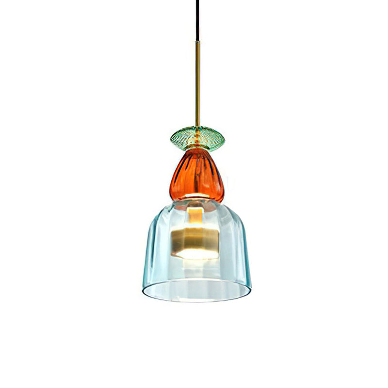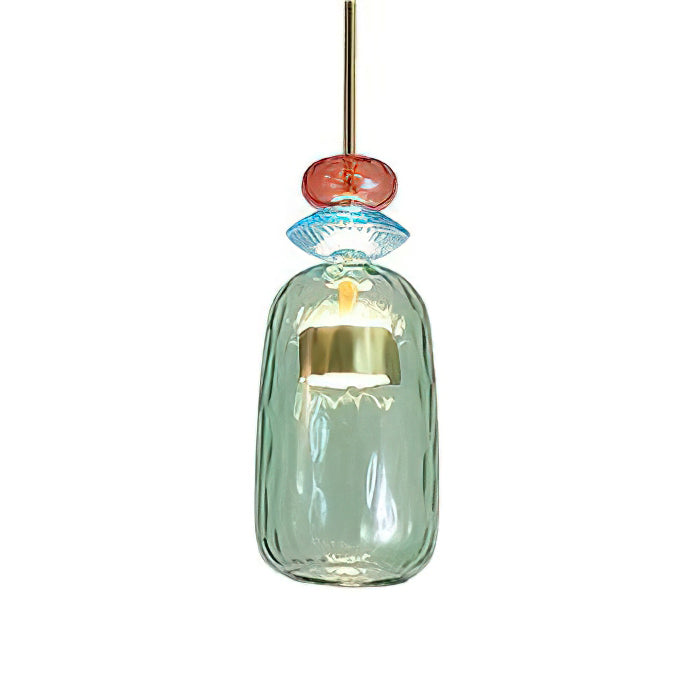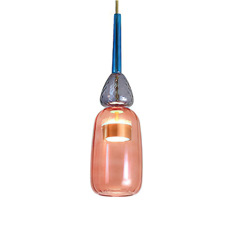 Lampa wisząca modern led szklana nad stołem ma klosz w kształcie słoika typu macaron.