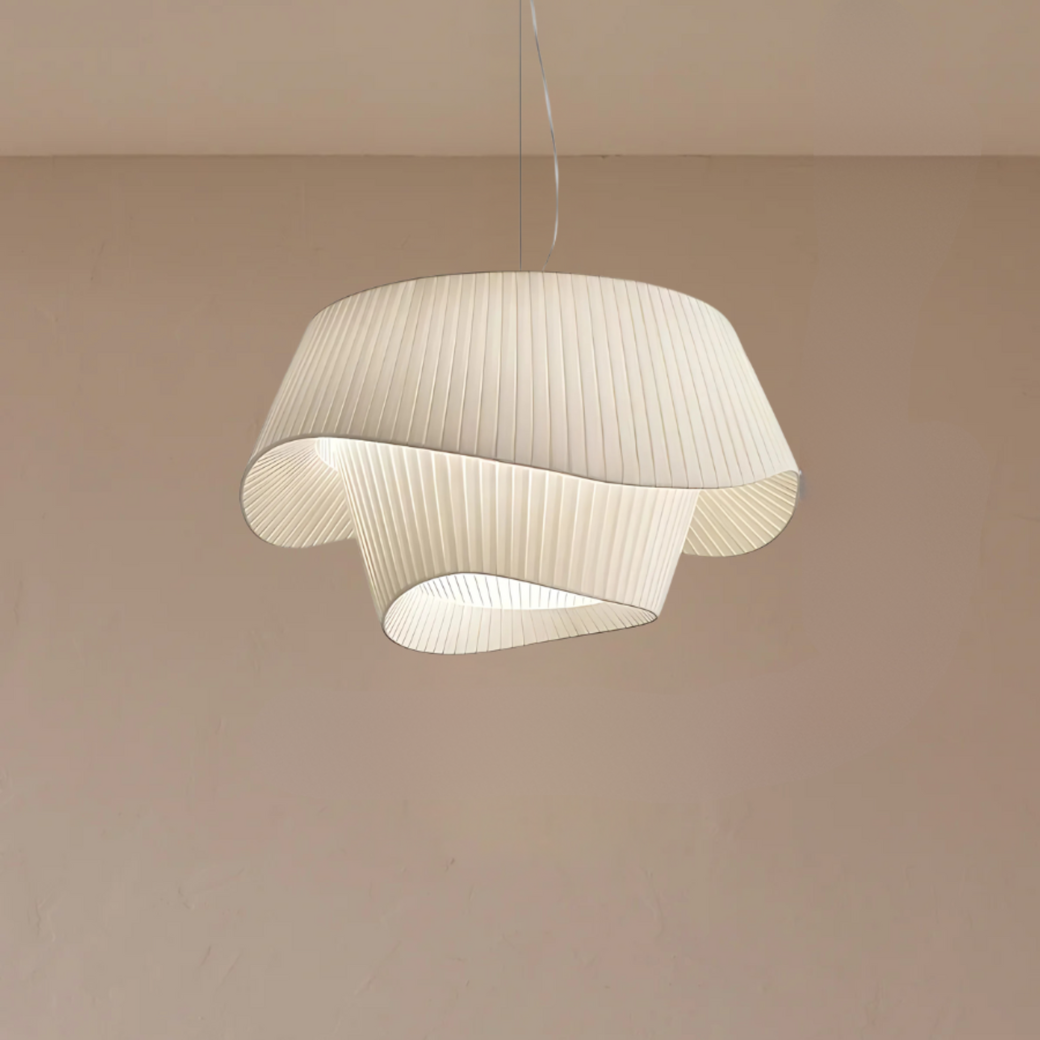Lampa wisząca nowoczesna dekoracyjna do salonu przedstawia lampę wiszącą uformowaną z plisowanych paneli ułożonych w pętle. Zagięcia powierzchni tworzą delikatną asymetrię, która definiuje kontur klosza. Ku górze forma układa się w uporządkowaną sylwetkę widoczną pod różnymi kątami.