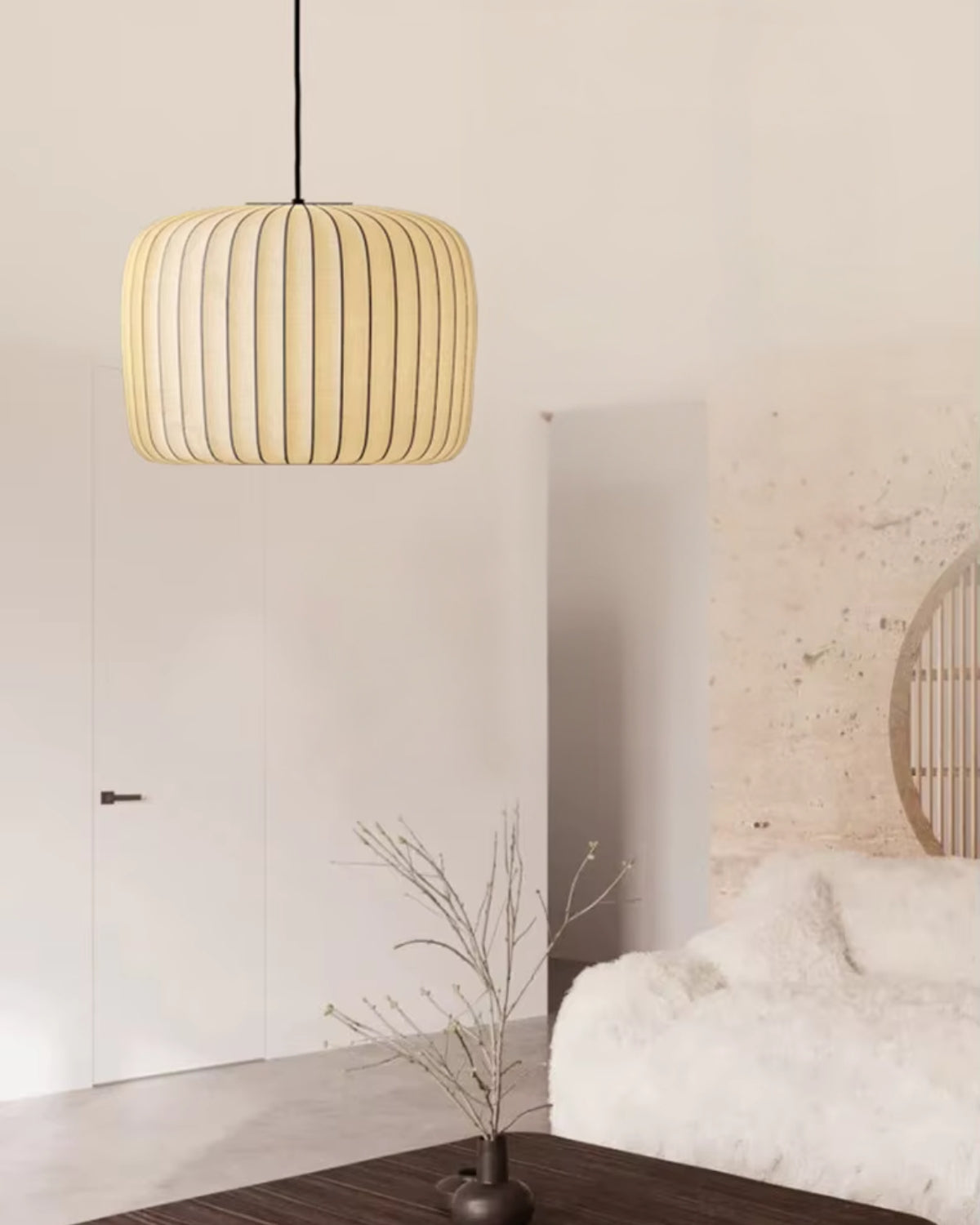 Lampa wisząca nowoczesna nad stołem jadalnianym posiada konstrukcję z kloszem o efekcie tkaniny, uformowanym w miękkie kontury. Rozciągnięta powierzchnia tworzy gładki, zaokrąglony profil podkreślający sylwetkę lampy. Zawieszona forma zapewnia czytelny i zrównoważony wygląd po zamontowaniu.