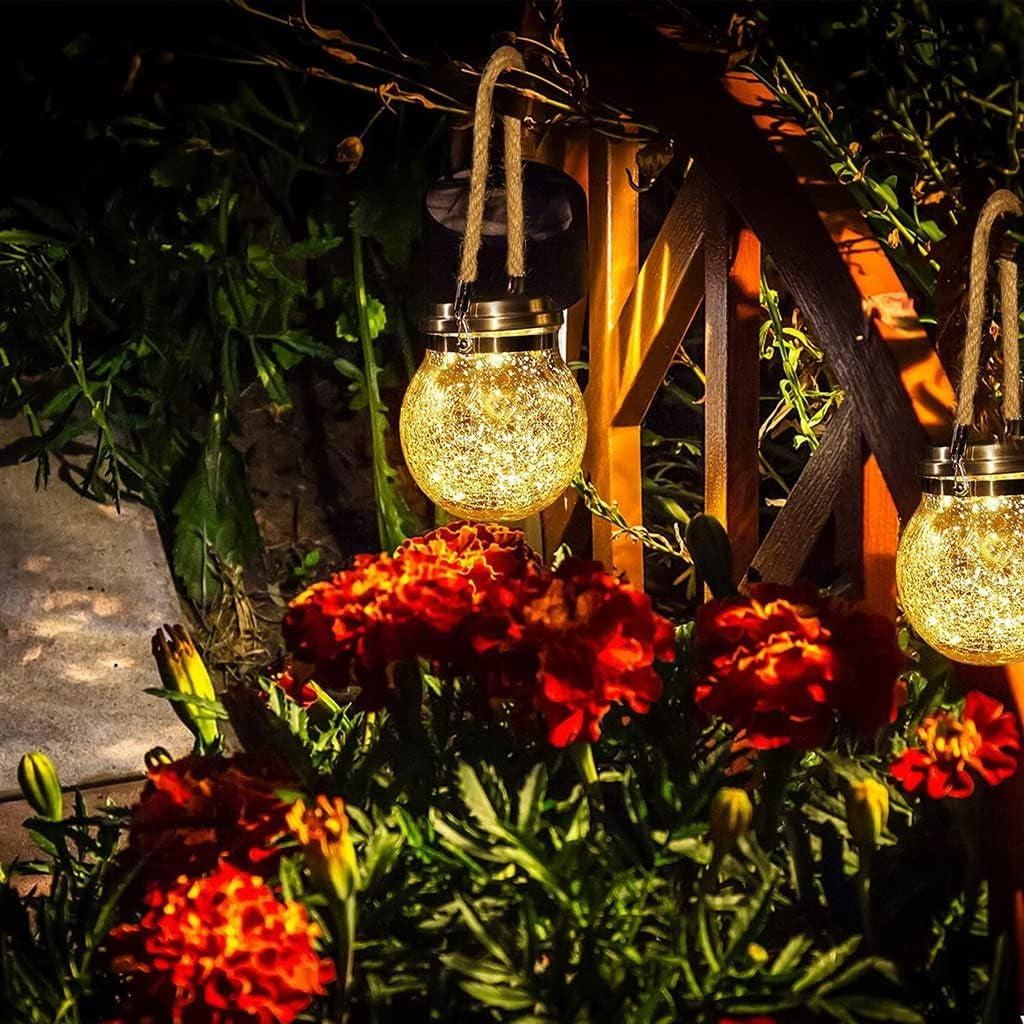 Zestaw zawiera dwie zewnętrzne lampy zasilane energią słoneczną. Każda lampa umieszczona jest w okrągłym szklanym pojemniku z zestawem lampek LED wewnątrz. Lampy mają uchwyt w stylu liny, który umożliwia ich zawieszenie na hakach lub gałęziach.