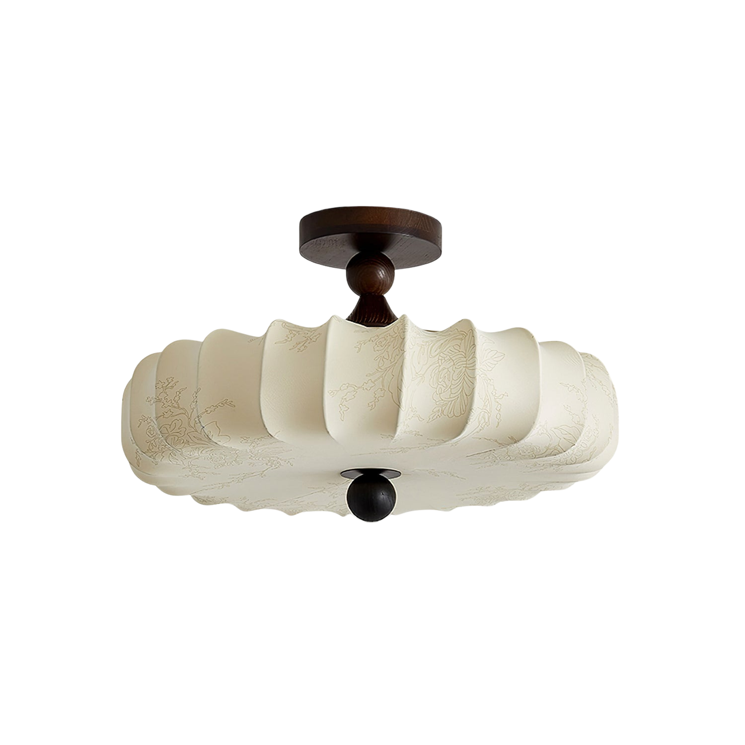 Lampa sufitowa klasyczna led biała w stylu retro posiada klosz z tkaniny ukształtowany gładkimi, równymi liniami. Na powierzchni widoczny jest szew powstały w trakcie szycia, który stanowi element konstrukcji klosza. Cała sylwetka zachowuje zrównoważony kontur podkreślający proporcje lampy w uporządkowany sposób.