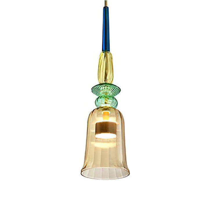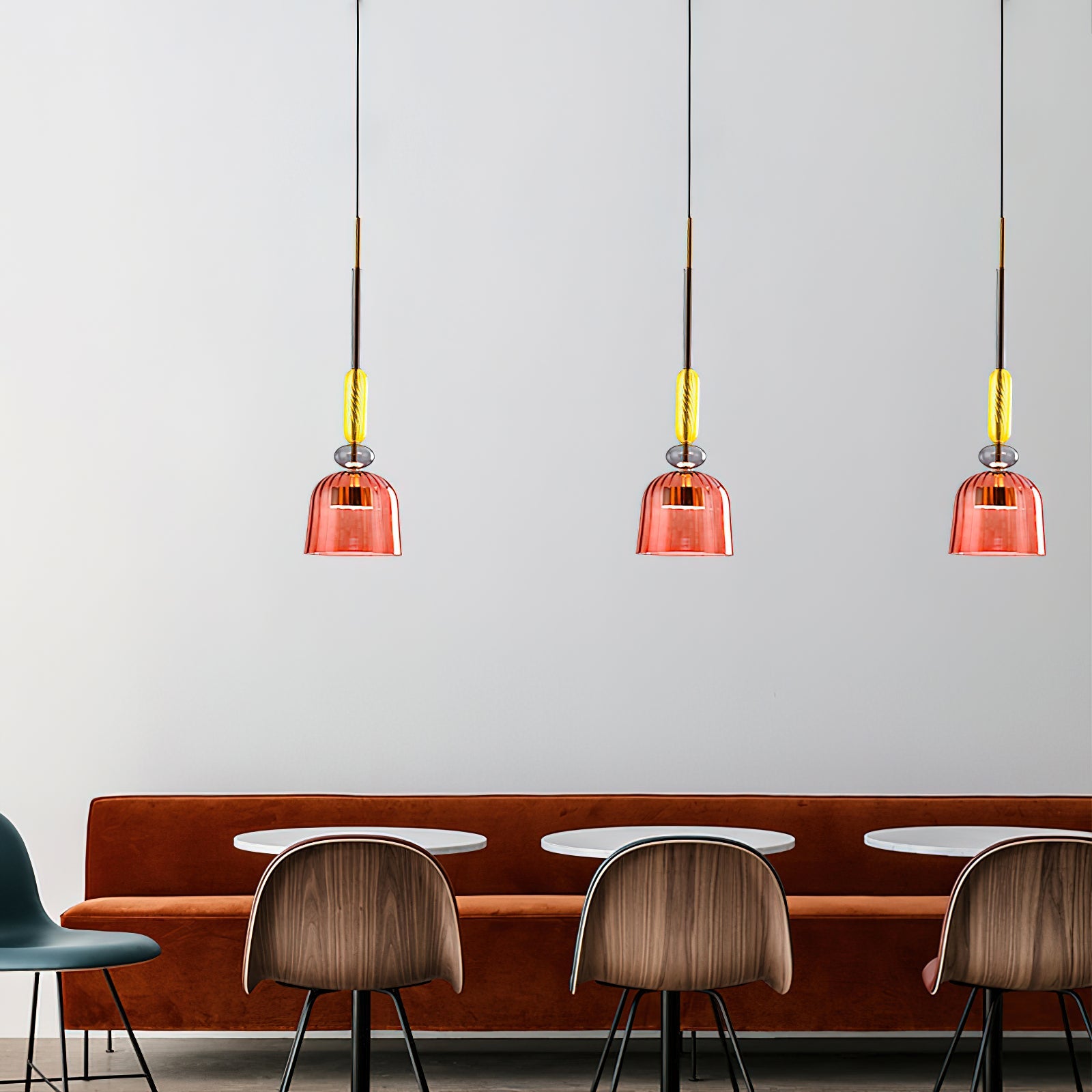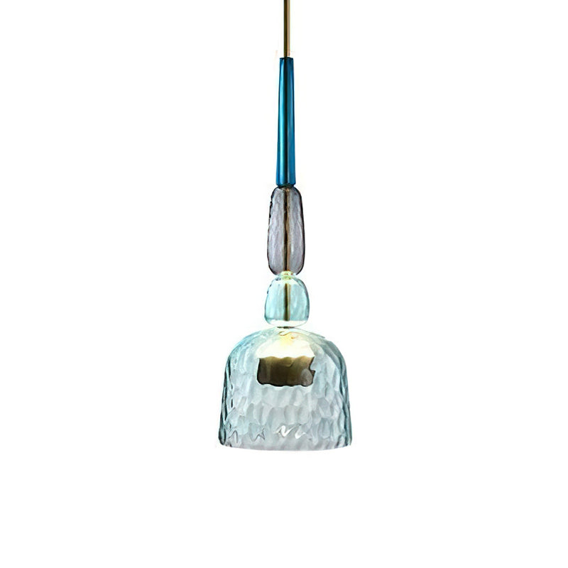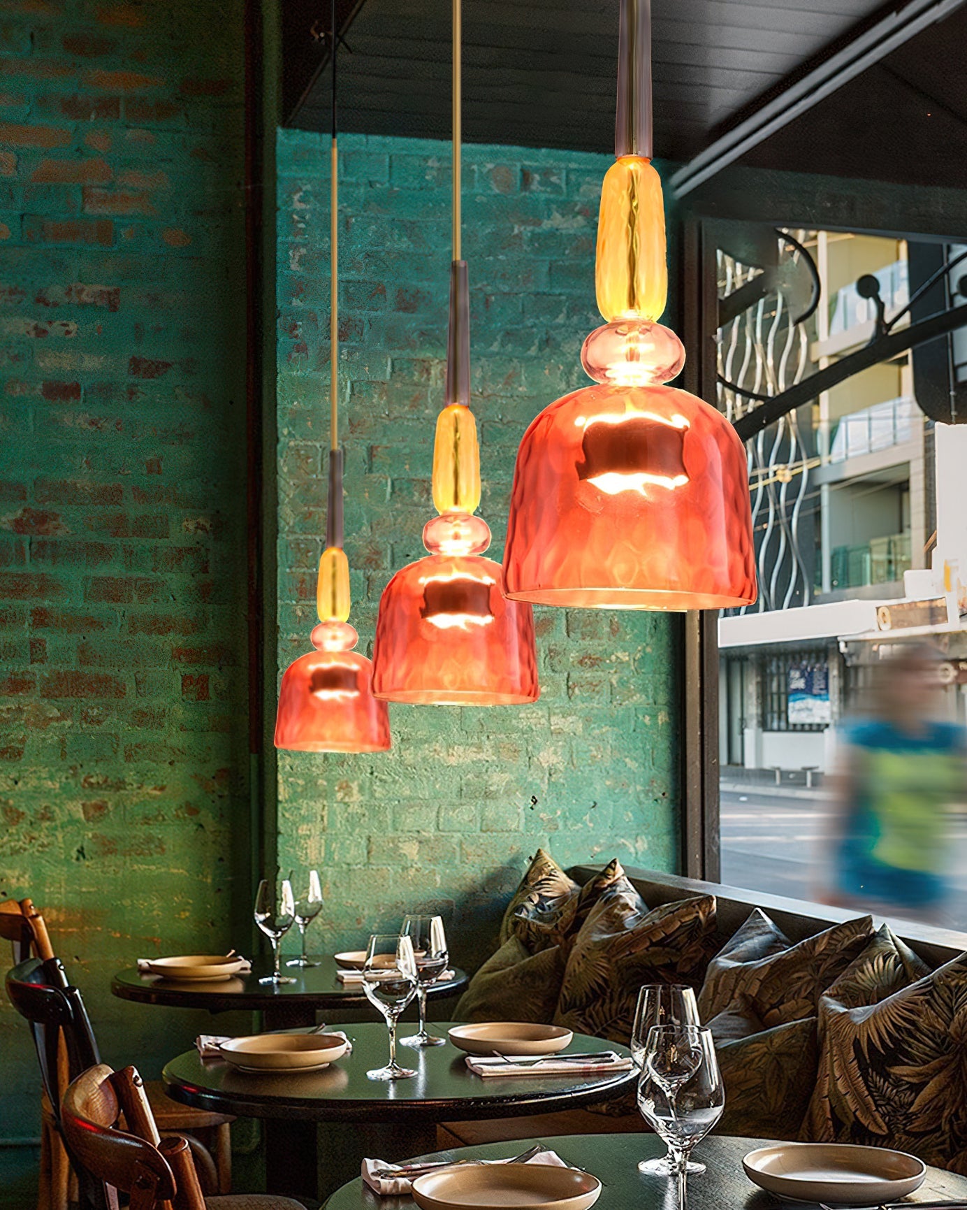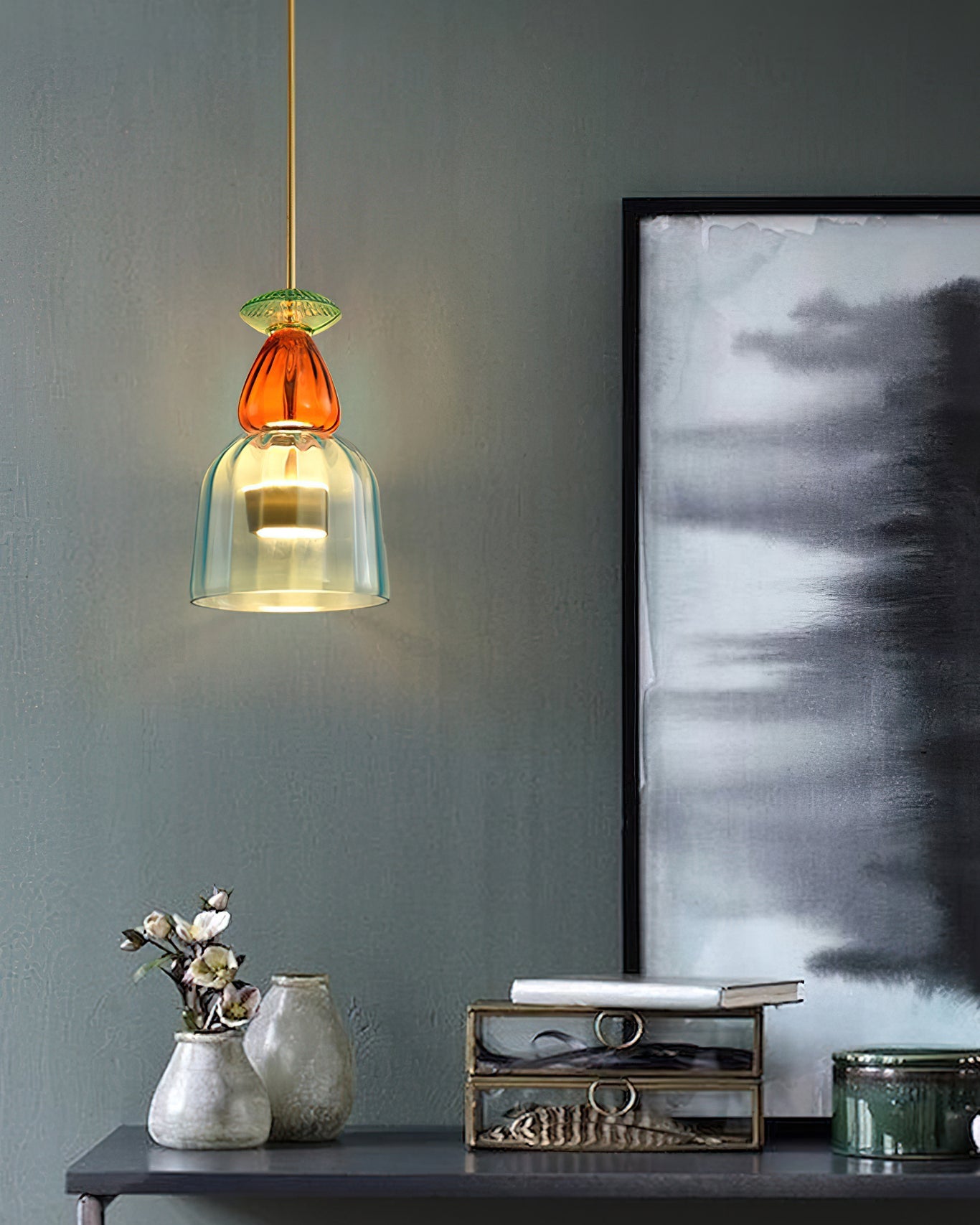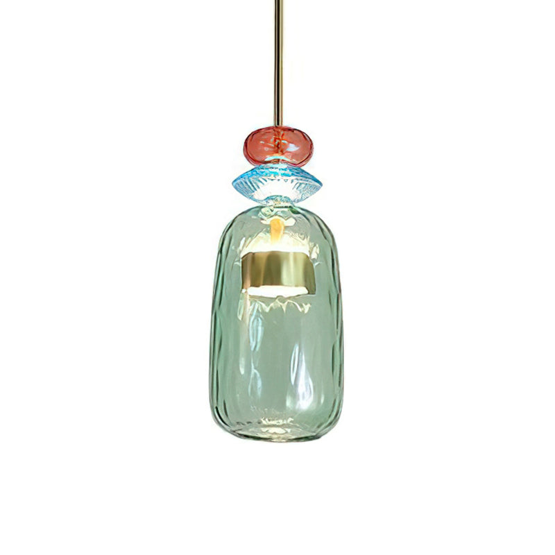 Lampa wisząca modern led szklana nad stołem ma klosz w kształcie słoika typu macaron.