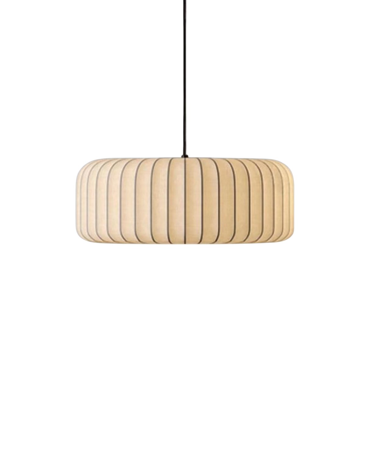 Lampa wisząca nowoczesna nad stołem jadalnianym posiada konstrukcję z kloszem o efekcie tkaniny, uformowanym w miękkie kontury. Rozciągnięta powierzchnia tworzy gładki, zaokrąglony profil podkreślający sylwetkę lampy. Zawieszona forma zapewnia czytelny i zrównoważony wygląd po zamontowaniu.