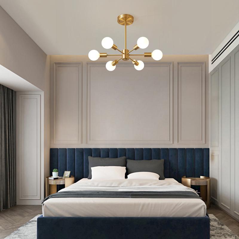 Ten żyrandol sufitowy typu Sputnik wykorzystuje sześć ramion zakończonych kulistymi kloszami. Konstrukcja umożliwia równomierne oświetlenie pomieszczenia i może być stosowana w salonie, jadalni lub sypialni. Forma sprawdza się w wielu rodzajach aranżacji wnętrz.